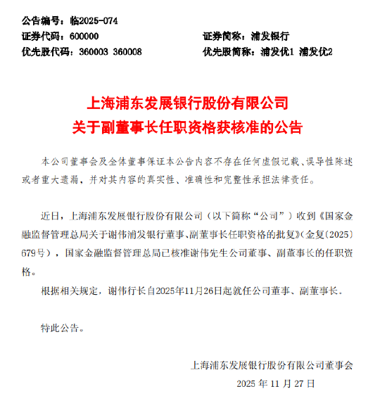 11月27日金融一线消息,发布公告称,近日,公司收到《国家金融监督管理总局关于谢伟浦发银行董事、副董事长任职资格的批复》,国家金融监督管理总局已核准谢伟公司董事、副董事长的任职资格。根据相关规定,谢伟行长自2025年11月26日起就任公司董事、副董事长。