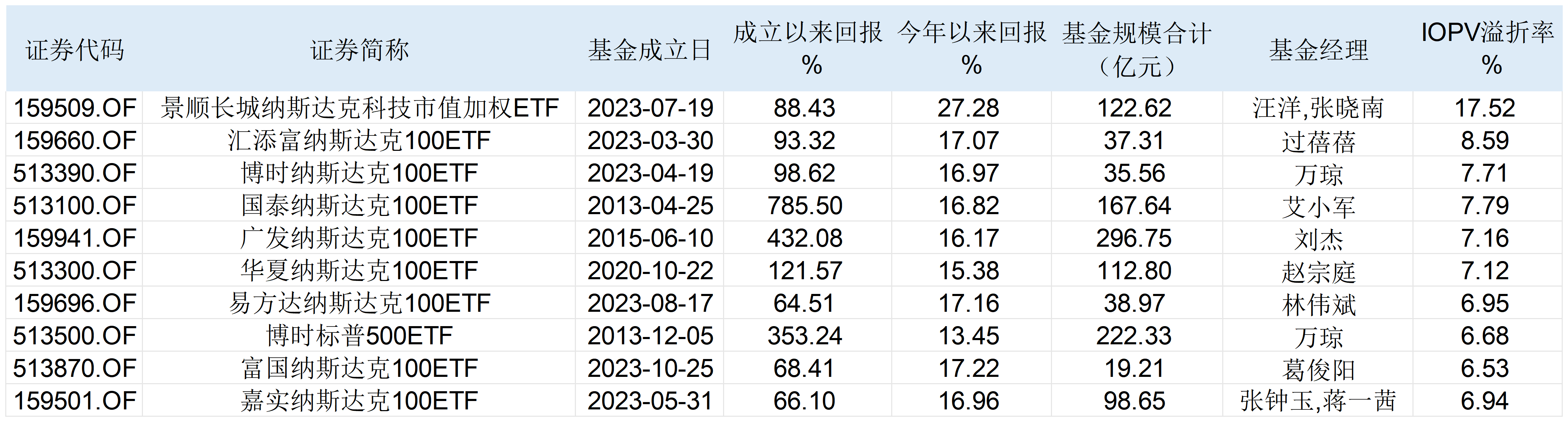 图:IPOV溢价率位居前10位的QDII-ETF明细       来源:Wind 界面新闻整理