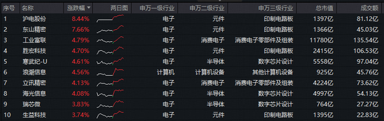 成份股方面,PCB(印制电路板)龙头涨超8%,涨逾7%,英伟达概念股涨超4%,果链龙头涨超4%,AI芯片龙头涨逾4%。