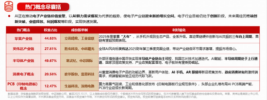值得关注的是,电子ETF(515260)标的指数囊括热门概念,截至10月底,苹果产业链权重占比44.63%,英伟达产业链权重占比27.81%,PCB(印制电路板)权重占比12.47%。