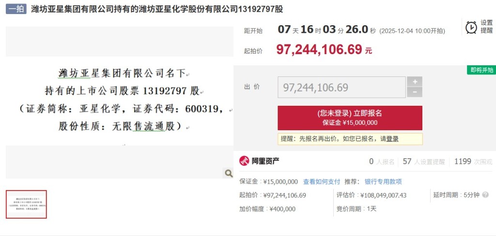 根据公告, 本次拍卖标的占亚星化学总股本 3.40%,山东省潍坊市中级人民法院将于 2025 年12 月4 日10 时至2025年12月5日10时止在阿里巴巴司法拍卖网络平台对上述股票进行第一次网络拍卖。